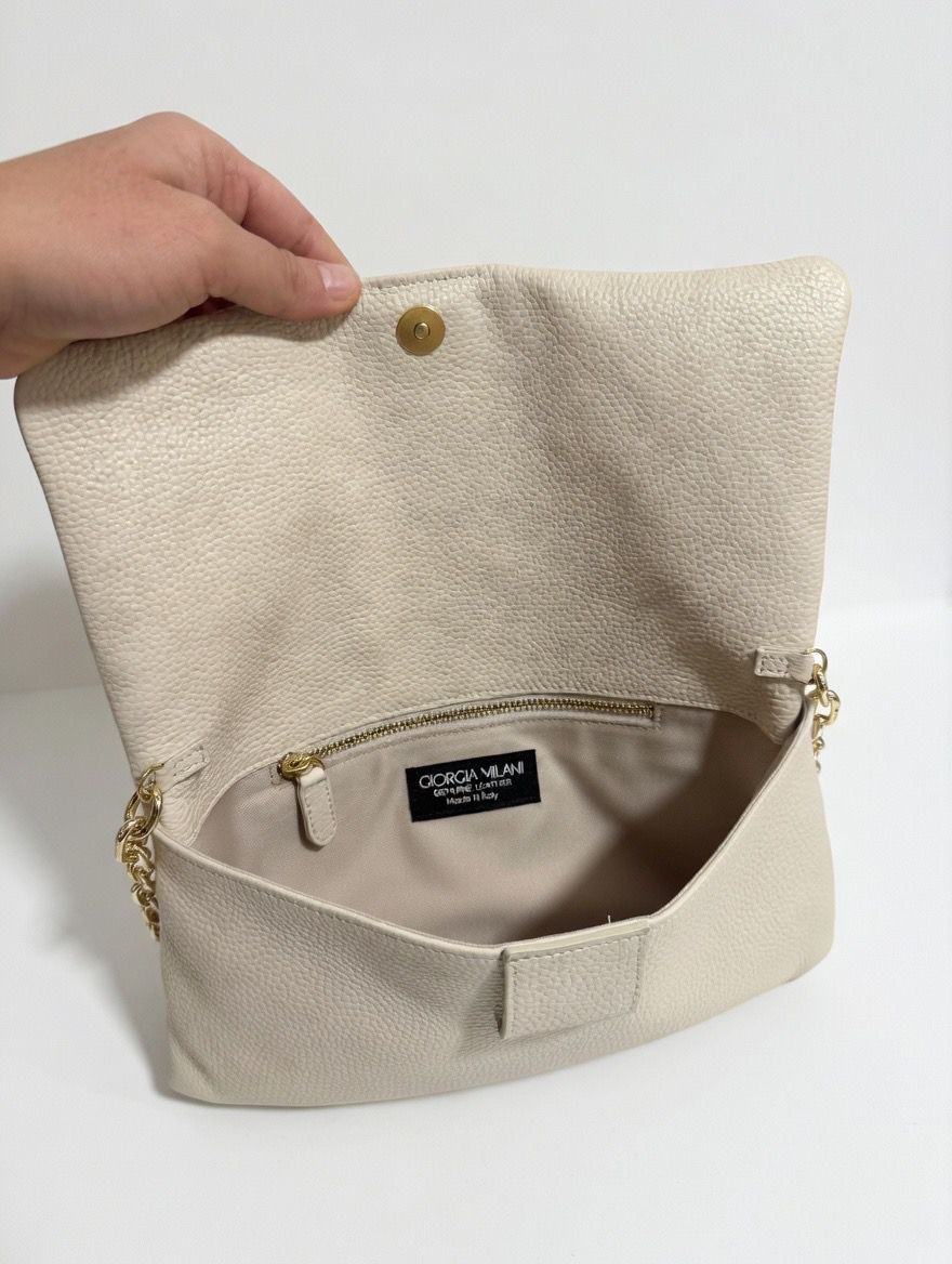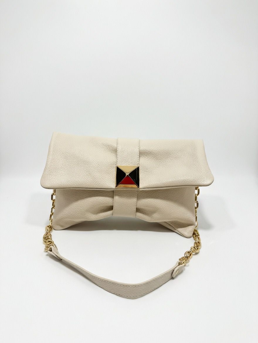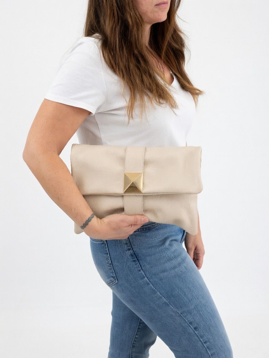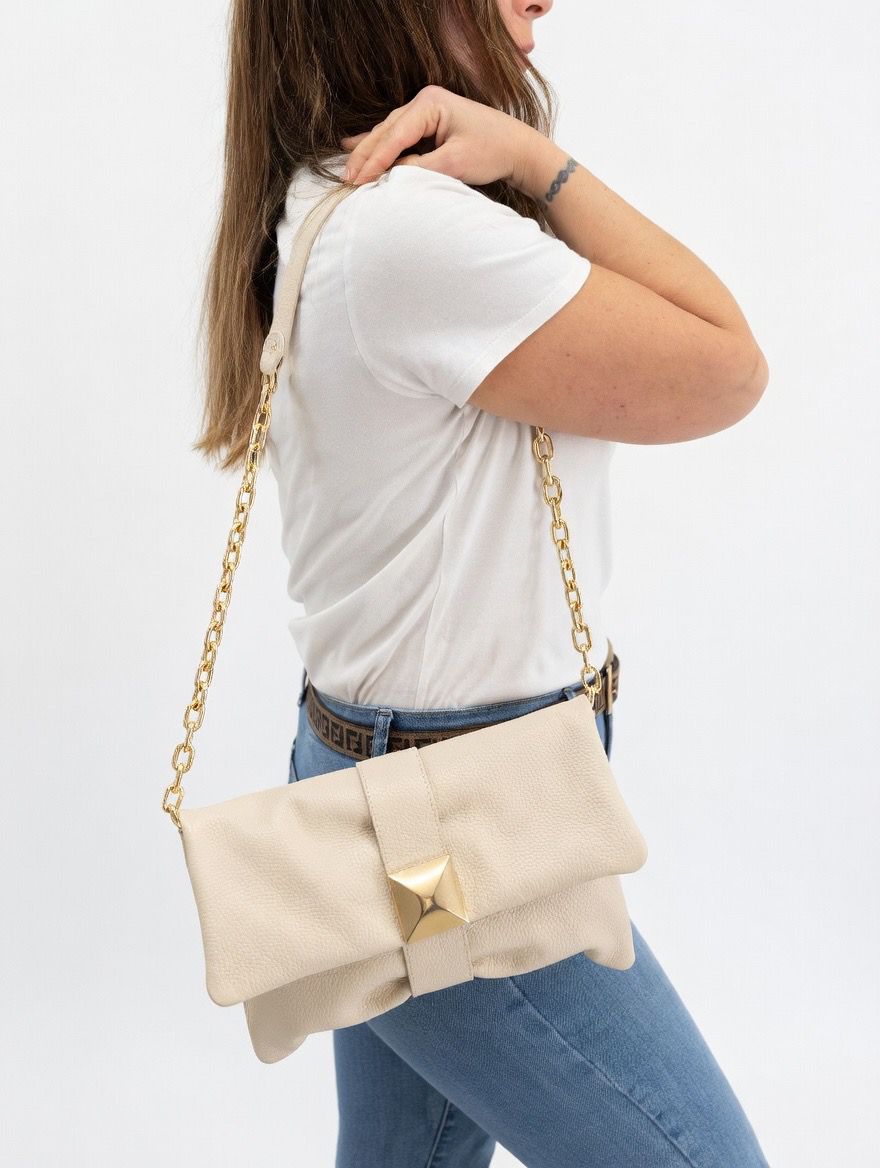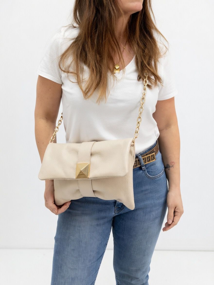 La Papillon è una pochette che racconta la tradizione artigianale italiana in ogni dettaglio. Realizzata in pelle bottalata, con la sua superficie morbida e naturalmente irregolare, la chiusura piramidale dal design scultorale e la tracolla in catena, è l’accessorio perfetto per chi ama il lusso autentico e senza tempo.