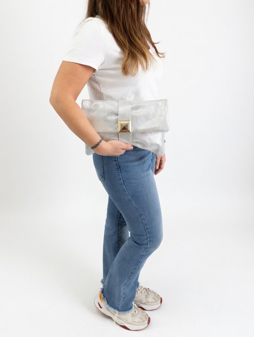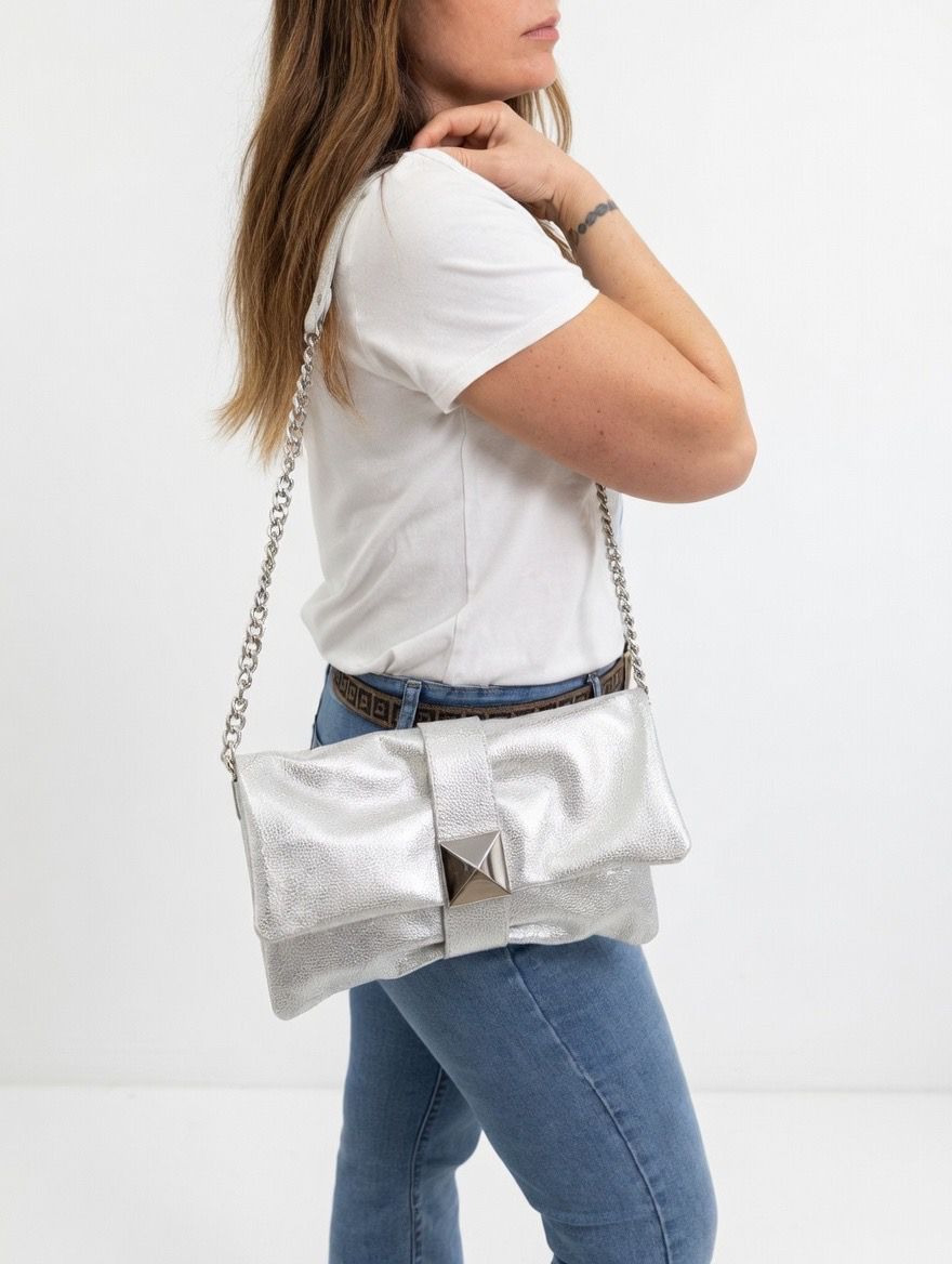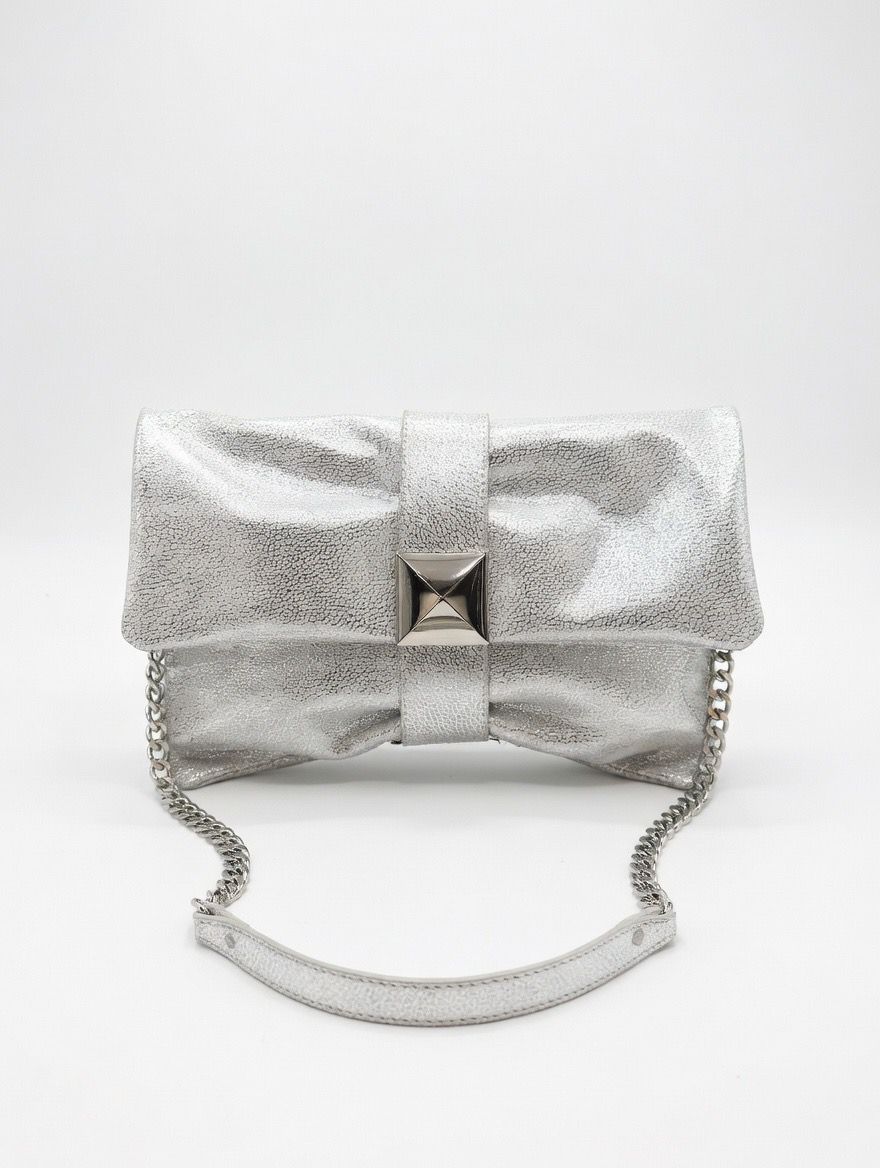 La Papillon è una pochette che cattura l’attenzione al primo sguardo. Realizzata in pelle scamosciata effetto laminato, con la sua chiusura piramidale dal design scultorale e la tracolla in catena, è l’accessorio perfetto per chi vuole brillare con stile e personalità tutta italiana.